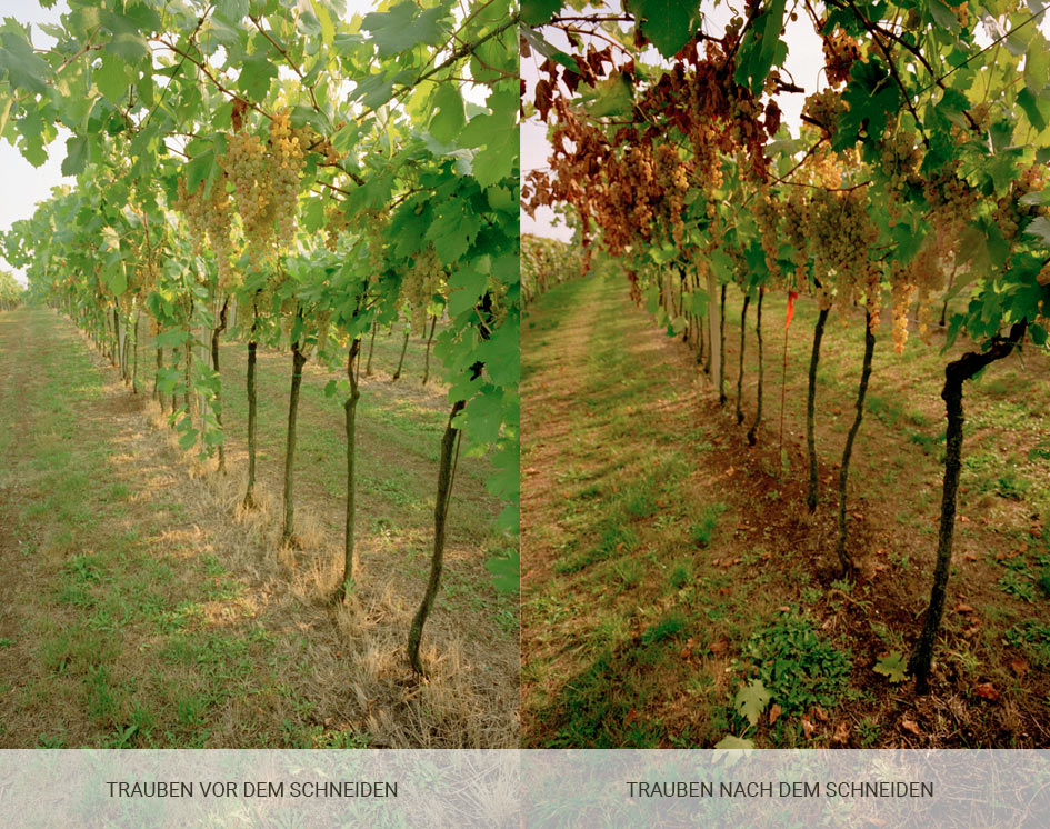 Der verschiedene Reifegrad der Trauben wird durch den Schnitt der Rebranke (vgl. obige Abbildung) erzielt.